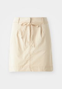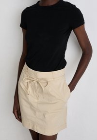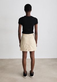 Personne portant une jupe beige mi-longue avec une ceinture nouée à l'avant, un haut noir et des baskets noires, debout sur un sol gris clair.