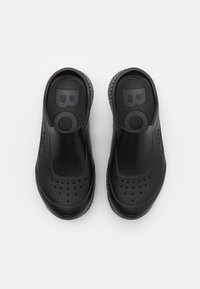 Sabots en caoutchouc noir au fini lisse, dotés d'un logo en relief et de trous de ventilation à l'avant, avec une semelle texturée pour une meilleure adhérence.