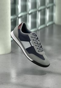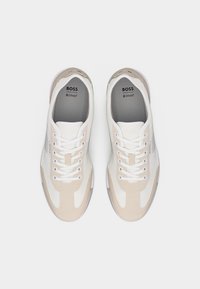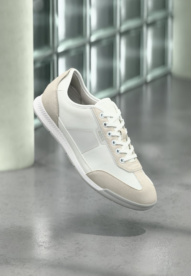 Baskets décontractées blanches et beiges avec lacets, panneaux texturés et logo "BOSS" sur le côté, flottant au-dessus d'un sol en béton poli.
