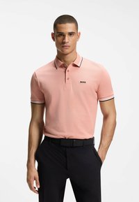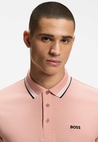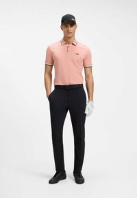 Homme portant un polo à manches courtes rose avec le logo "BOSS", ceinture noire et pantalon noir, debout devant un fond blanc.