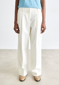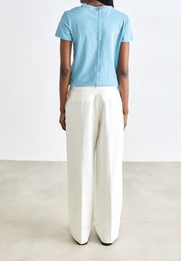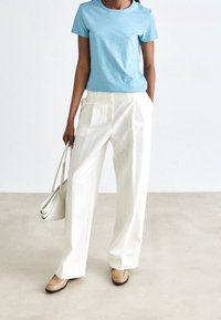 Pantalons large en crème, en tissu lisse. Présente des plis avant et une taille haute. Associés à un haut bleu clair et des chaussures beiges.