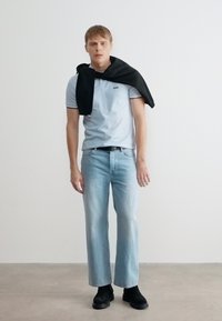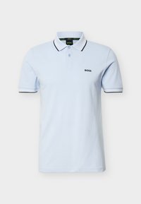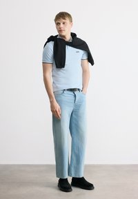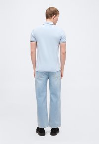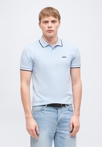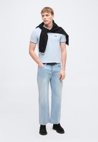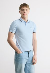 Jeune homme portant un polo à manches courtes bleu clair avec le logo "BOSS" et un jean bleu clair, debout devant un fond uni.