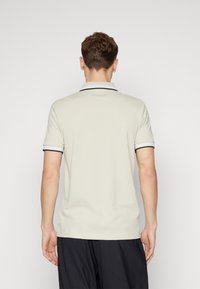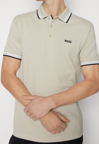 Polo beige en tissu texturé avec une patte à trois boutons, col rayé noir et blanc, et logo "BOSS" brodé.