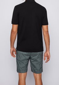 Polo noir avec un col classique et deux boutons, associé à un short vert texturé avec une finition brillante.