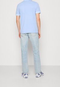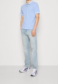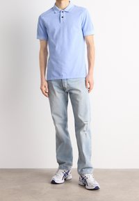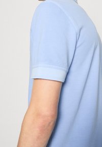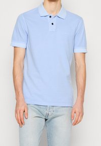 Polo bleu clair à manches courtes, avec une patte de boutonnage à deux boutons et un logo discret sur la poitrine. Confectionné en tissu de coton doux avec une texture lisse.
