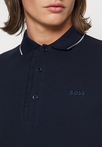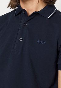 Polo bleu clair, mélange de coton, manches courtes, patte à deux boutons, col contrastant, logo de la marque "BOSS" sur la poitrine, texture lisse.