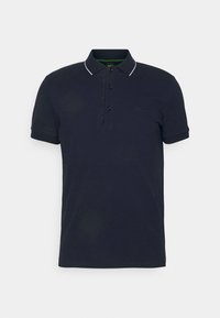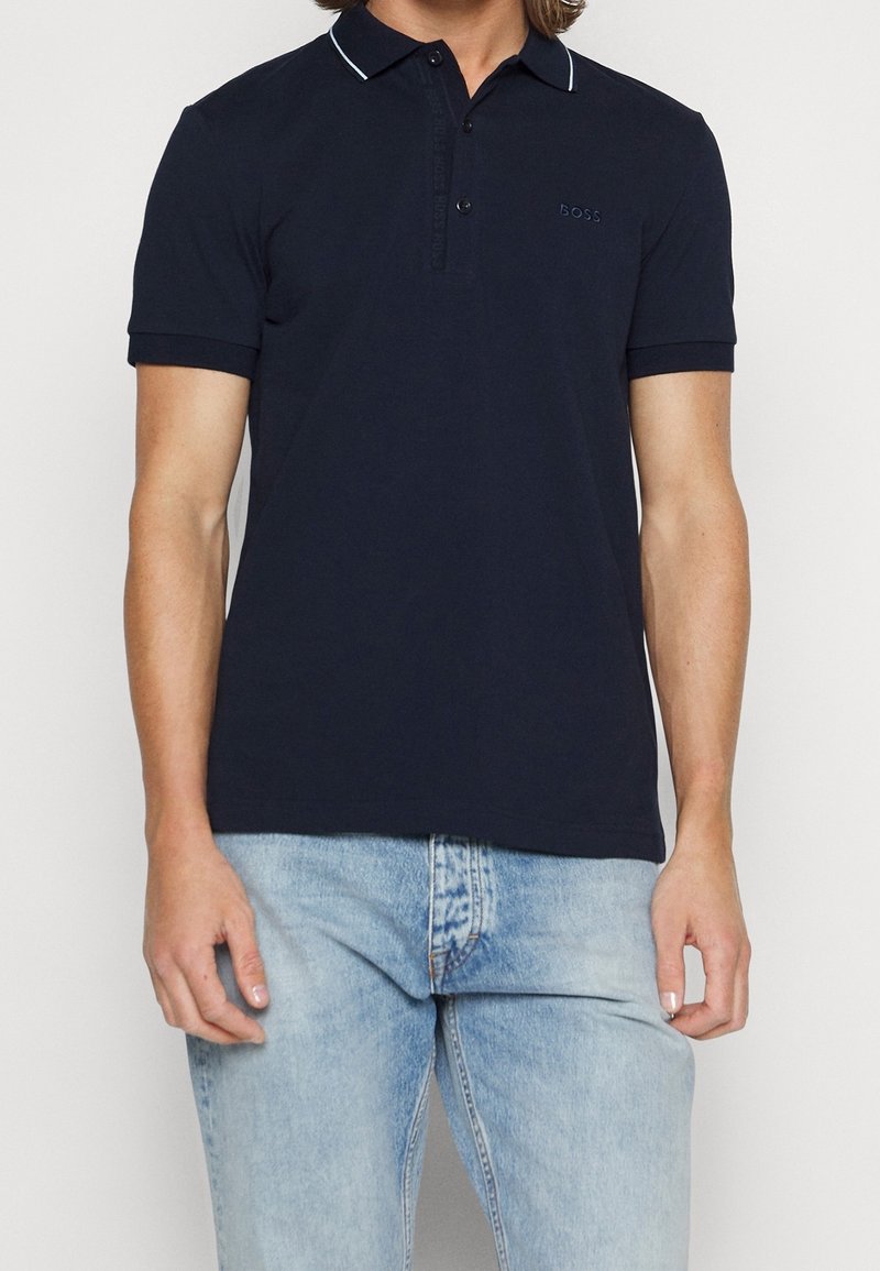 Polo bleu marine avec col et accents blancs, en coton doux. Présente une patte à trois boutons et un petit logo sur la poitrine.