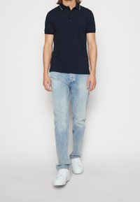 Polo manches longues bleu marine en coton, avec col, deux boutons et un petit patch logo de la marque sur la poitrine. Assorti à un jean foncé.