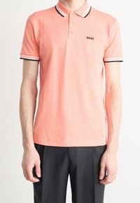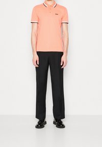 Polo orange avec col, présentant des rayures contrastantes noires et blanches sur le col et les bords des manches. Logo sur le côté gauche de la poitrine.