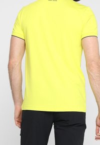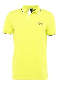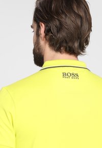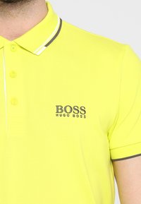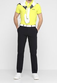 Homme portant un polo Hugo Boss jaune vif rentré dans un pantalon noir avec une ceinture blanche, les mains reposant près des poches.