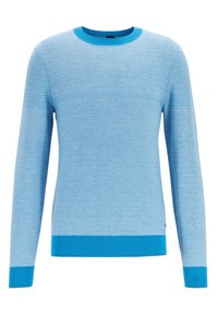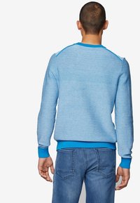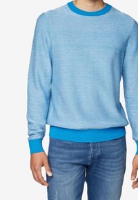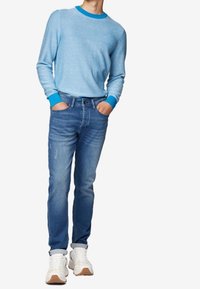 Homme portant un pull en laine bleu clair avec des poignets, un col et un ourlet bleu plus foncé, associé à un jean bleu de lavage moyen.