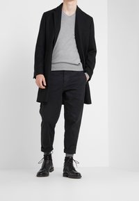 Homme portant un pull à col en V gris clair à manches longues et un pantalon noir, debout avec les bras détendus le long du corps.