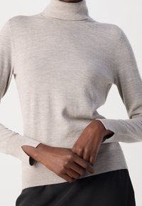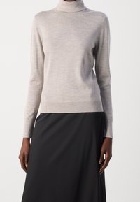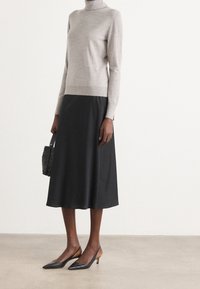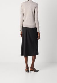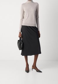 Personne portant un pull à col roulé gris clair avec des poignets fendus et une jupe noire, vue de profil sur un fond uni.