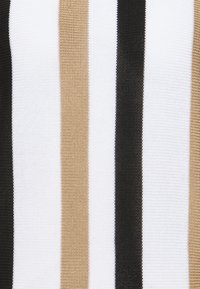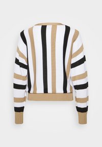 Pull en tricot à manches longues avec rayures verticales et horizontales beige, blanches et noires, col rond, poignets et ourlet côtelés.