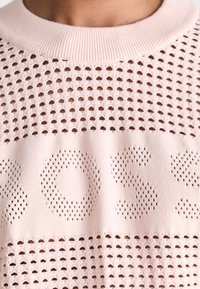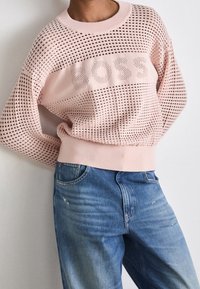 Pull en maille rose clair à motifs perforés avec le texte "BOSS" sur la poitrine, porté avec un jean bleu délavé taille haute.