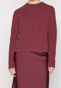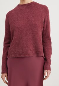 Femme portant un pull doux à manches longues de couleur grenat assorti à une jupe grenat, sur un fond uni.