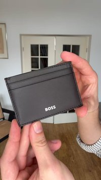 Porte-cartes en cuir noir avec trois emplacements pour cartes et logo "BOSS" argenté sur le devant, présenté sur un fond blanc uni.