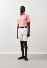 Homme à la peau foncée et aux dreadlocks portant une chemise rose à manches courtes boutonnée et un pantalon blanc avec une ceinture tissée noire.