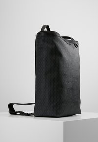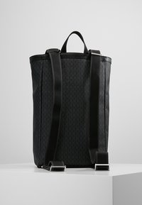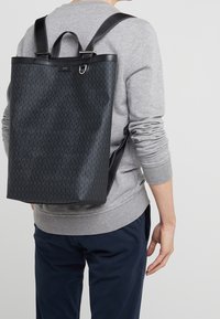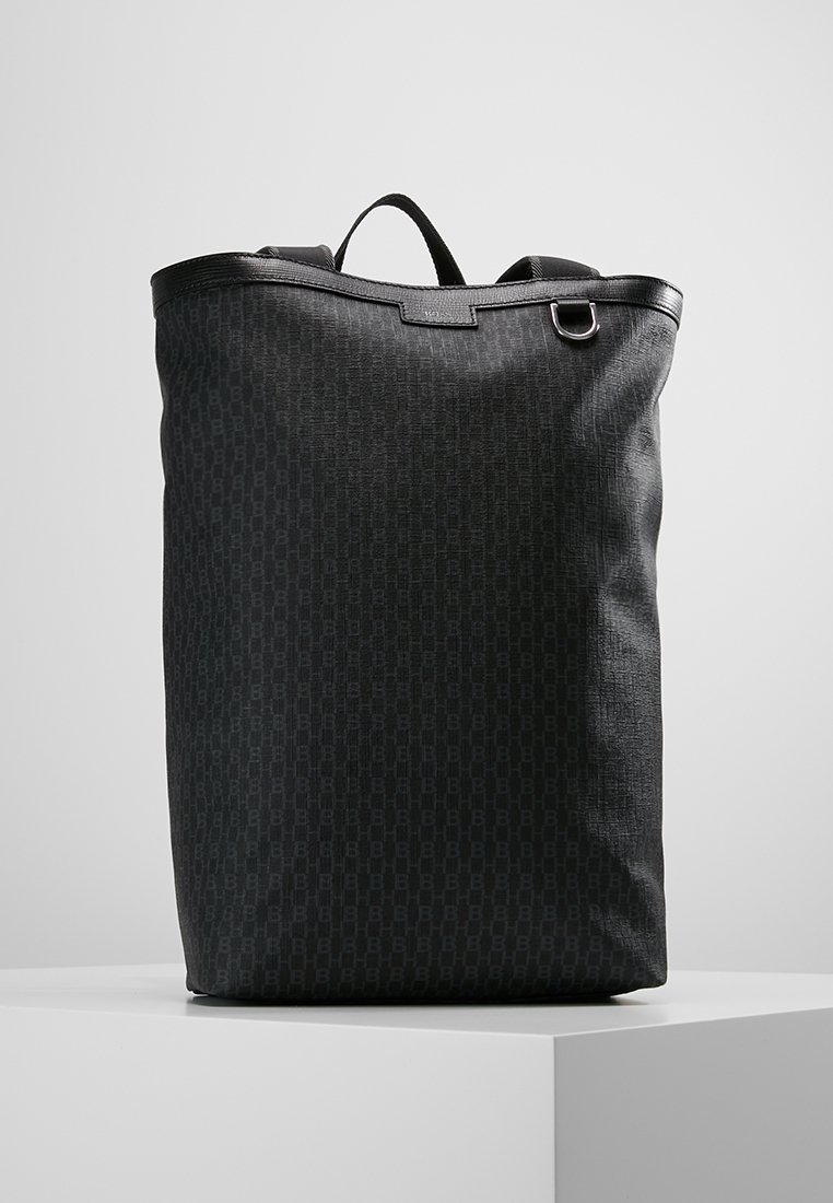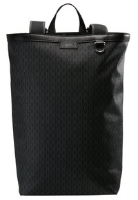 Sac à dos haut en tissu noir texturé avec motif subtil, garniture en cuir, poignée supérieure, anneau en D et bretelles rembourrées, posé sur un socle blanc.
