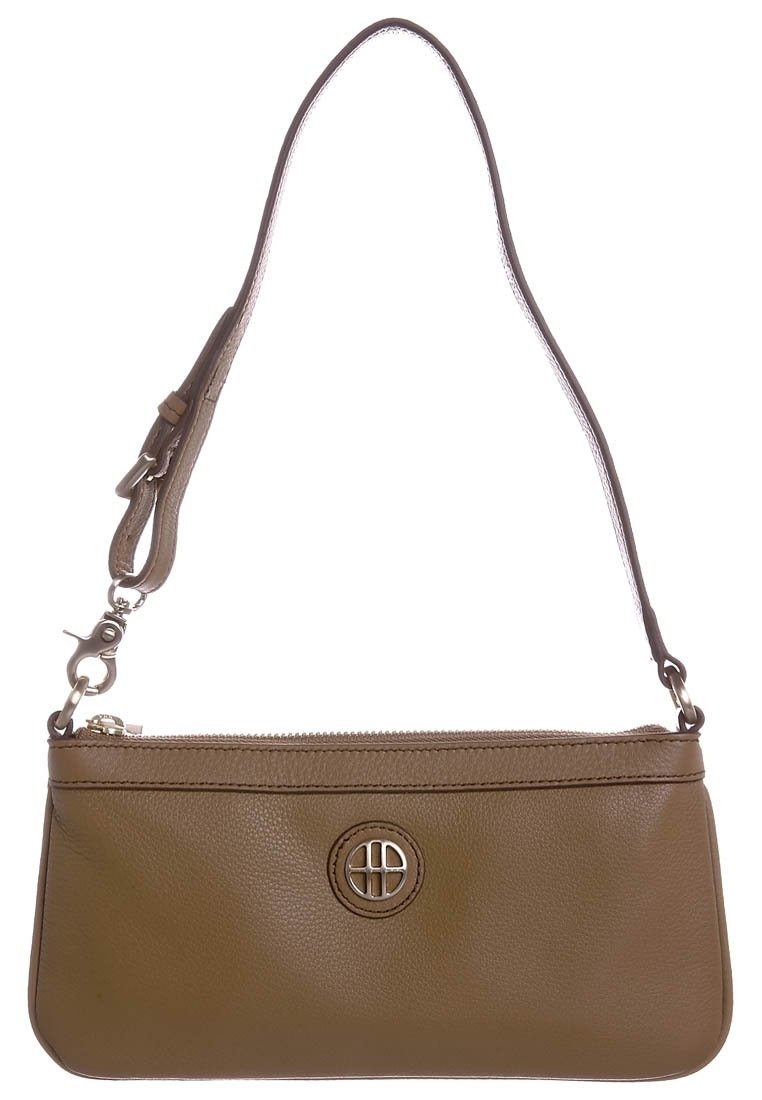 Petit sac à bracelet en cuir marron avec surface texturée, fermeture éclair, sangle réglable et logo métallique circulaire au centre avant.