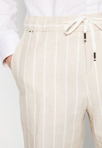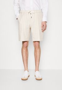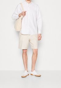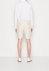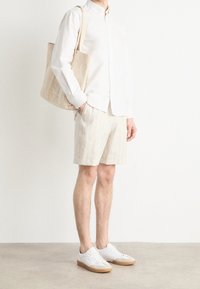 Short beige à rayures verticales en tissu léger, doté d'une taille à cordon de serrage et de poches latérales. Porté avec des baskets blanches.