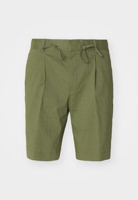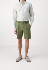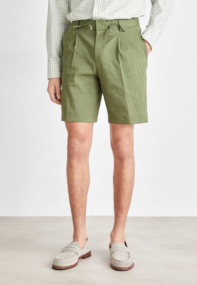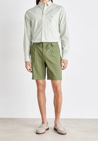 Shorts verts clairs plissés avec une taille élastique et un cordon de serrage, fabriqués en tissu texturé. Associés à des mocassins gris clair.
