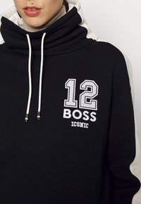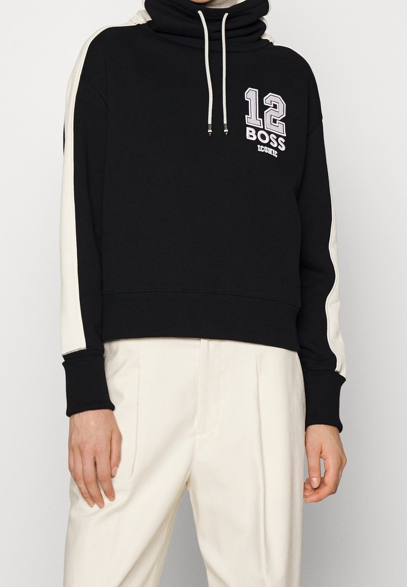 Hoodie noir et blanc avec le texte "12 BOSS ICONIC" sur la poitrine, cordons blancs et bandes blanches sur les côtés, porté avec un pantalon blanc.