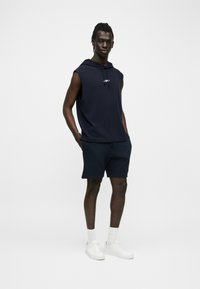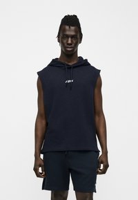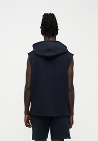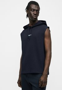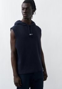 Jeune homme à la peau foncée et aux dreadlocks, portant un sweat à capuche sans manches bleu marine avec un petit logo, debout devant un fond gris uni.