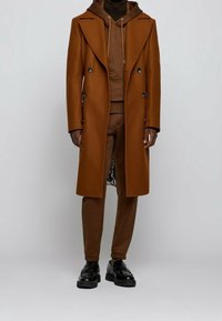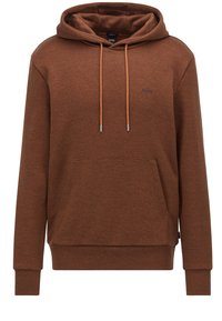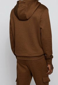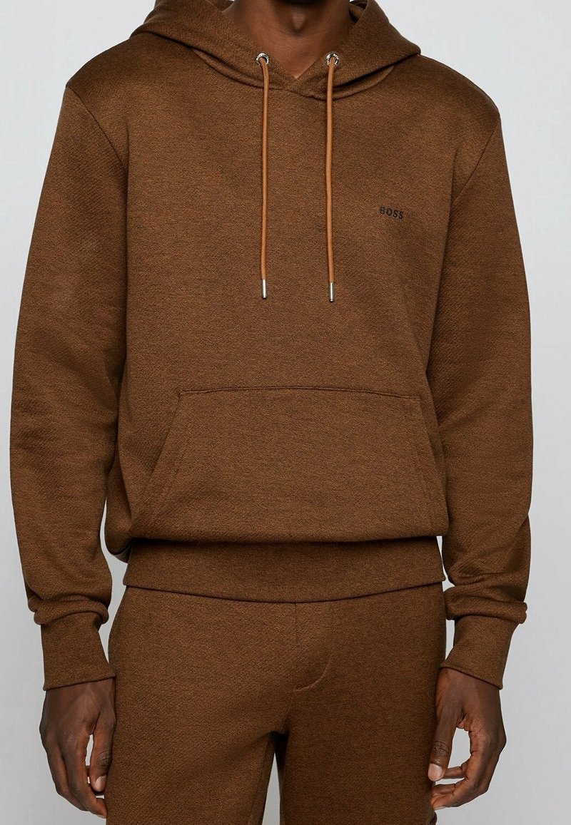 Homme portant un sweat à capuche brun texturé et un pantalon de survêtement assorti avec une poche avant et des cordons de serrage.