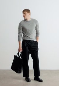 Jeune homme portant un pull léger à manches longues gris clair avec le texte « BOSS », un pantalon noir et une ceinture noire, debout devant un fond blanc uni.