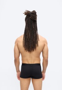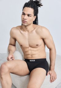 Homme athlétique avec de longues dreadlocks, torse nu, portant un boxer noir BOSS, regardant sur le côté sur un fond uni clair.
