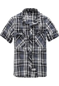 Chemise à manches courtes à carreaux dans des tons de gris et de noir, avec deux poches poitrine et un col boutonné. Tissu léger avec une finition texturée.