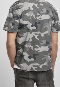 Homme portant une chemise à manches courtes à boutons camouflage gris et noir par-dessus un t-shirt blanc, avec une main dans la poche et un jean gris.
