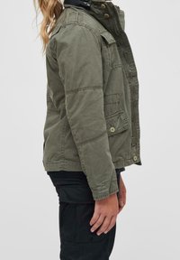Personne portant une veste vert olive non zippée avec des poches poitrine et latérales boutonnées, sur une chemise noire et un pantalon noir.