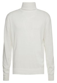 Homme portant un pull à col roulé blanc uni et un pantalon noir, debout devant un fond neutre.