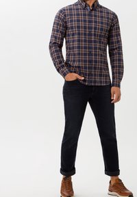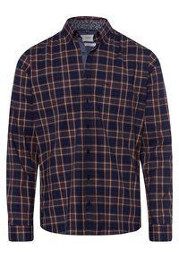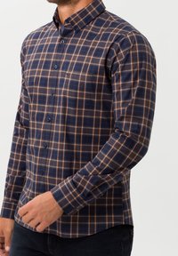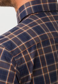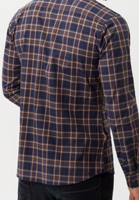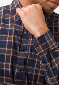 Homme portant une chemise à carreaux bleu marine et marron à manches longues avec poche poitrine, montré du cou aux hanches sur fond uni.