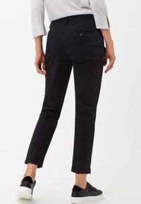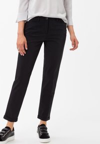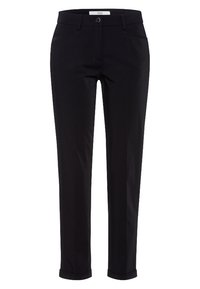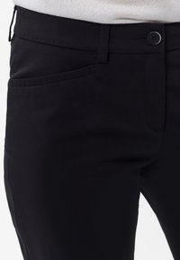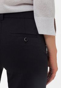 Pantalon noir ajusté à jambes droites avec fermeture avant à boutons et zip, passants pour ceinture, et ourlets retroussés.