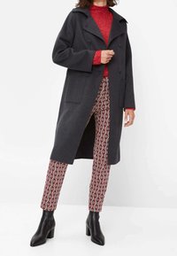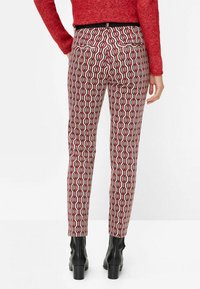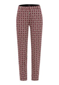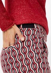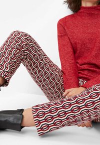 Femme portant un pantalon slim à motifs géométriques rouges, noirs et blancs, des bottines noires et un pull rouge, debout avec une main dans la poche.