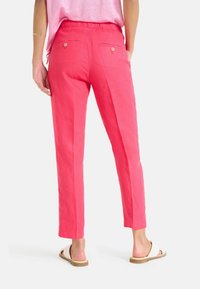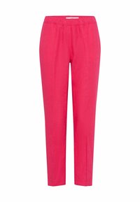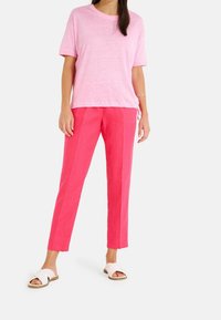 Femme portant un pantalon rose vif à jambes droites et des sandales plates blanches à brides croisées, debout les mains dans les poches devant un fond uni.