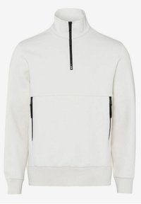 Homme portant un sweat à col montant blanc avec des fermetures éclair noires sur la poitrine et les poches, associé à un pantalon foncé.