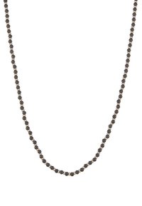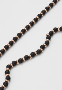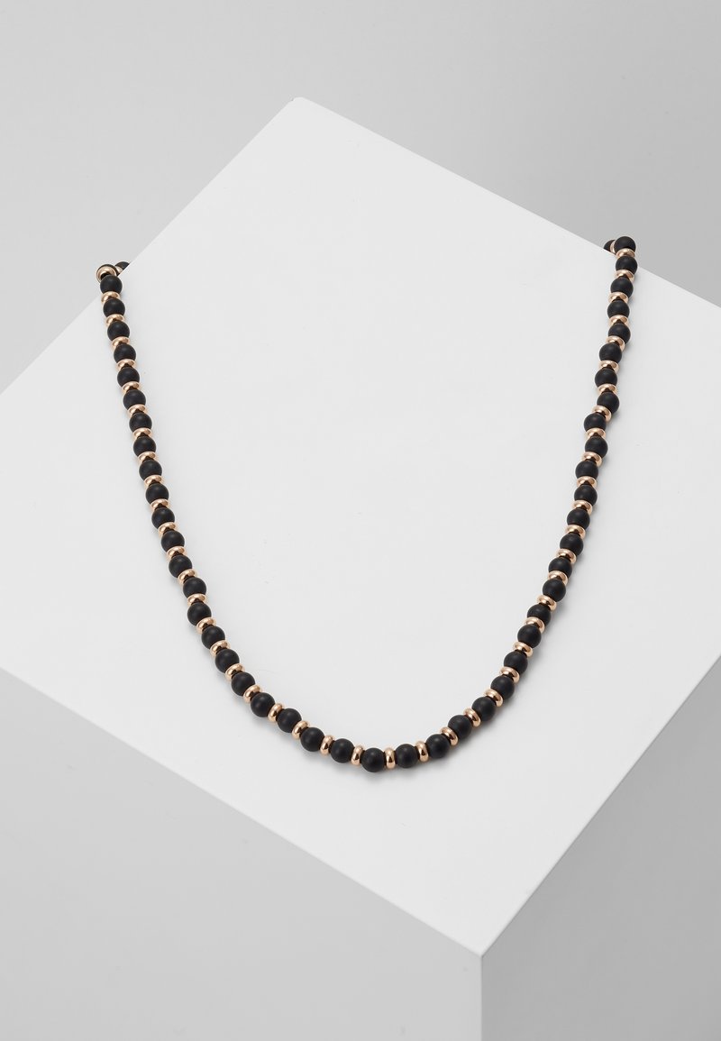 Collier de perles noires rondes avec de petites perles espacées dorées disposées uniformément sur un socle blanc incliné contre un fond gris.