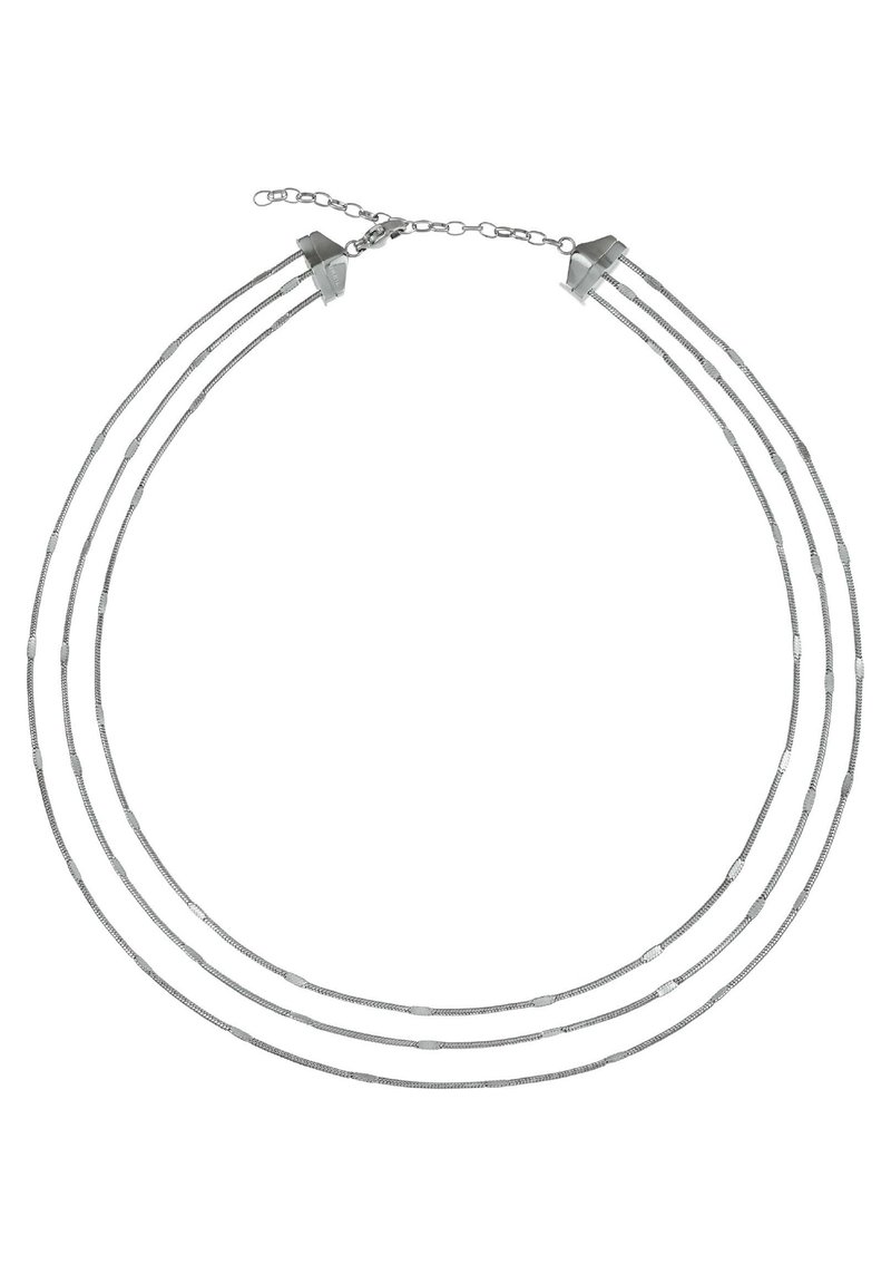 Collier argent à triple rangée avec de petites perles rectangulaires espacées uniformément le long de chaque chaîne et un fermoir mousqueton avec longueur ajustable.