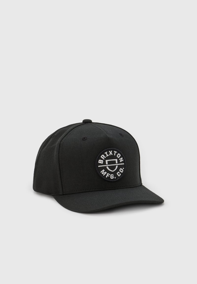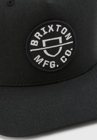 Casquette de baseball noire avec un patch rond à l'avant présentant le texte "BRIXTON MFG. CO." et un logo de bouclier stylisé en broderie blanche.