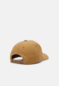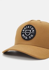 Casquette de baseball beige à visière courbée avec un écusson circulaire noir portant l'inscription "Brixton MFG. Co." au centre avant.