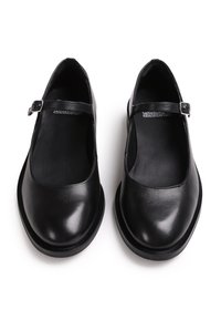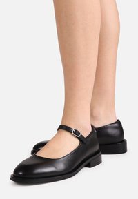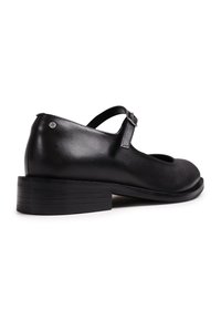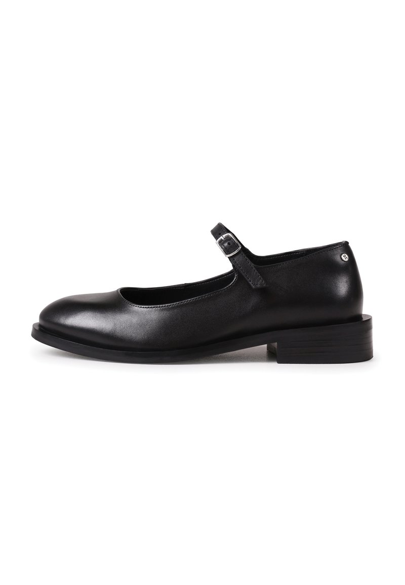 Chaussure Mary Jane en cuir noir avec un petit talon carré et une bride réglable avec boucle argentée sur fond blanc.