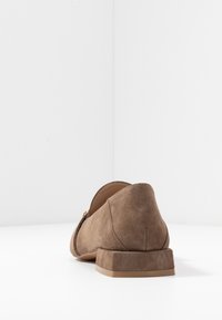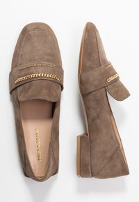 Mocassins en daim marron avec accent chaîne ; talon plat, orteil pointu et design chausson, associés à un pantalon de couleur crème.