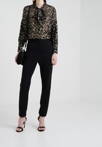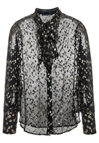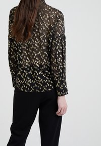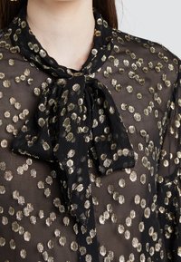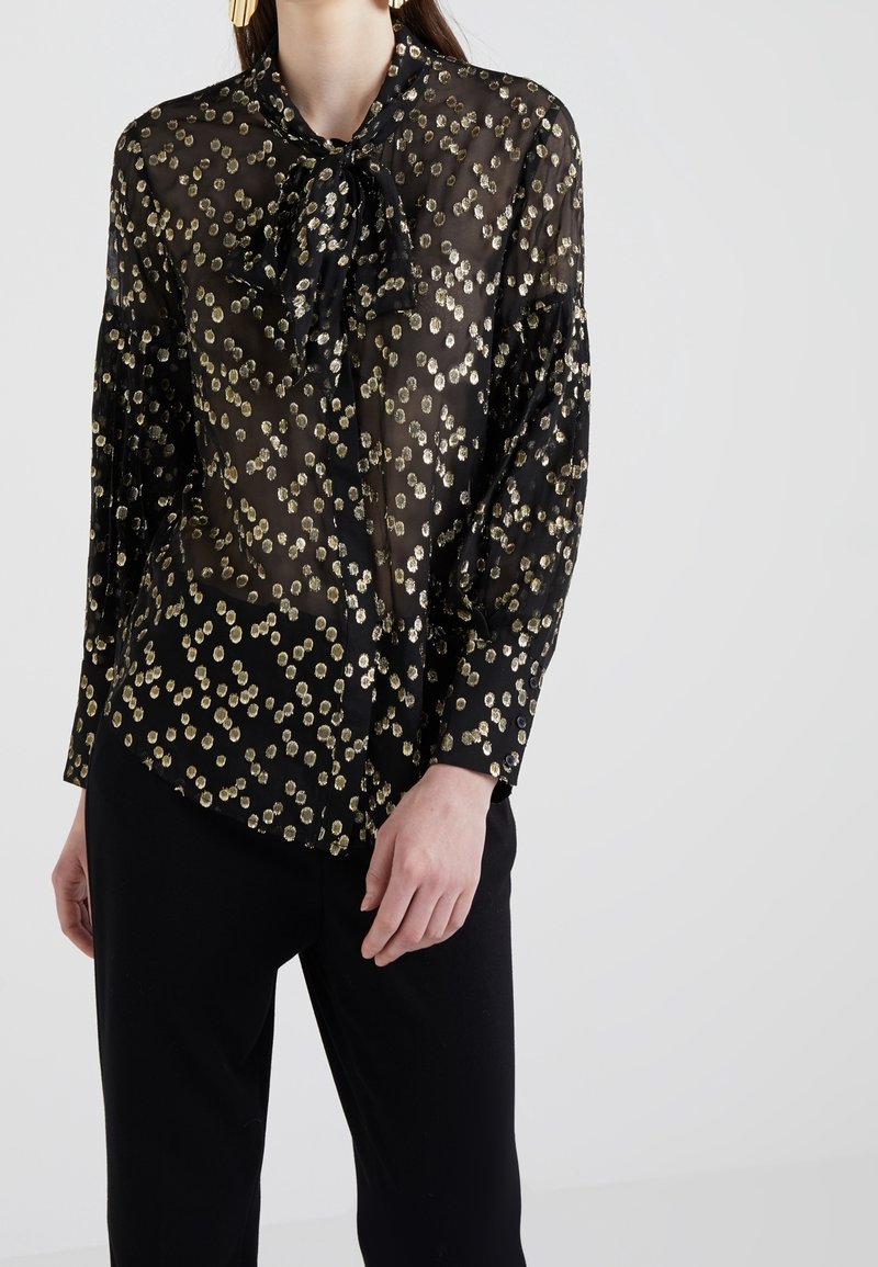 Femme portant un chemisier transparent noir à pois métalliques dorés, col noué en forme de nœud, et manches longues, associé à un pantalon noir.