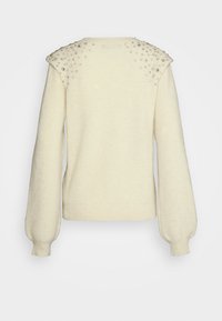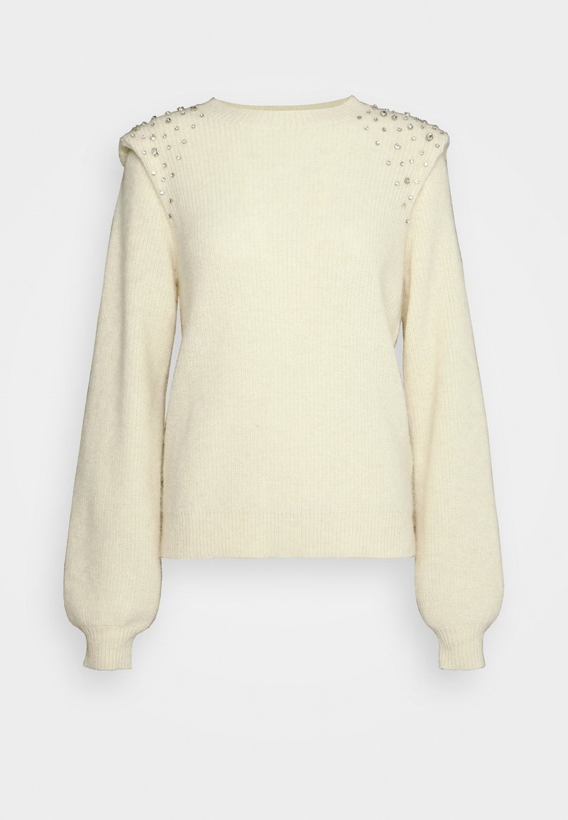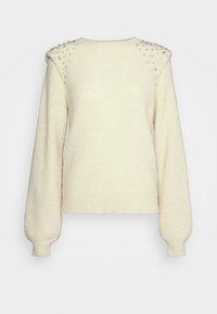 Pull en tricot crème avec manches longues bouffantes et ornements de perles argentées sur les épaulières, poignets et bas côtelés.