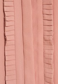 Robe rose blush en tissu léger, avec des manches courtes à volants et un détail de volant vertical sur le devant.