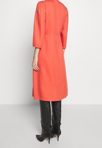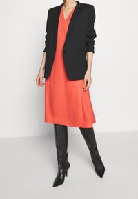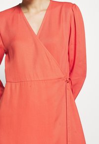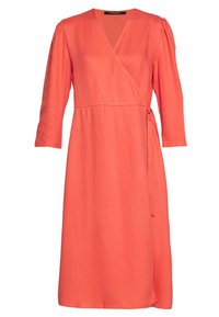 Robe portefeuille corail avec manches trois-quarts, dotée d'un décolleté en V et d'une texture lisse. Associée à des bottes noires montant jusqu'aux genoux.